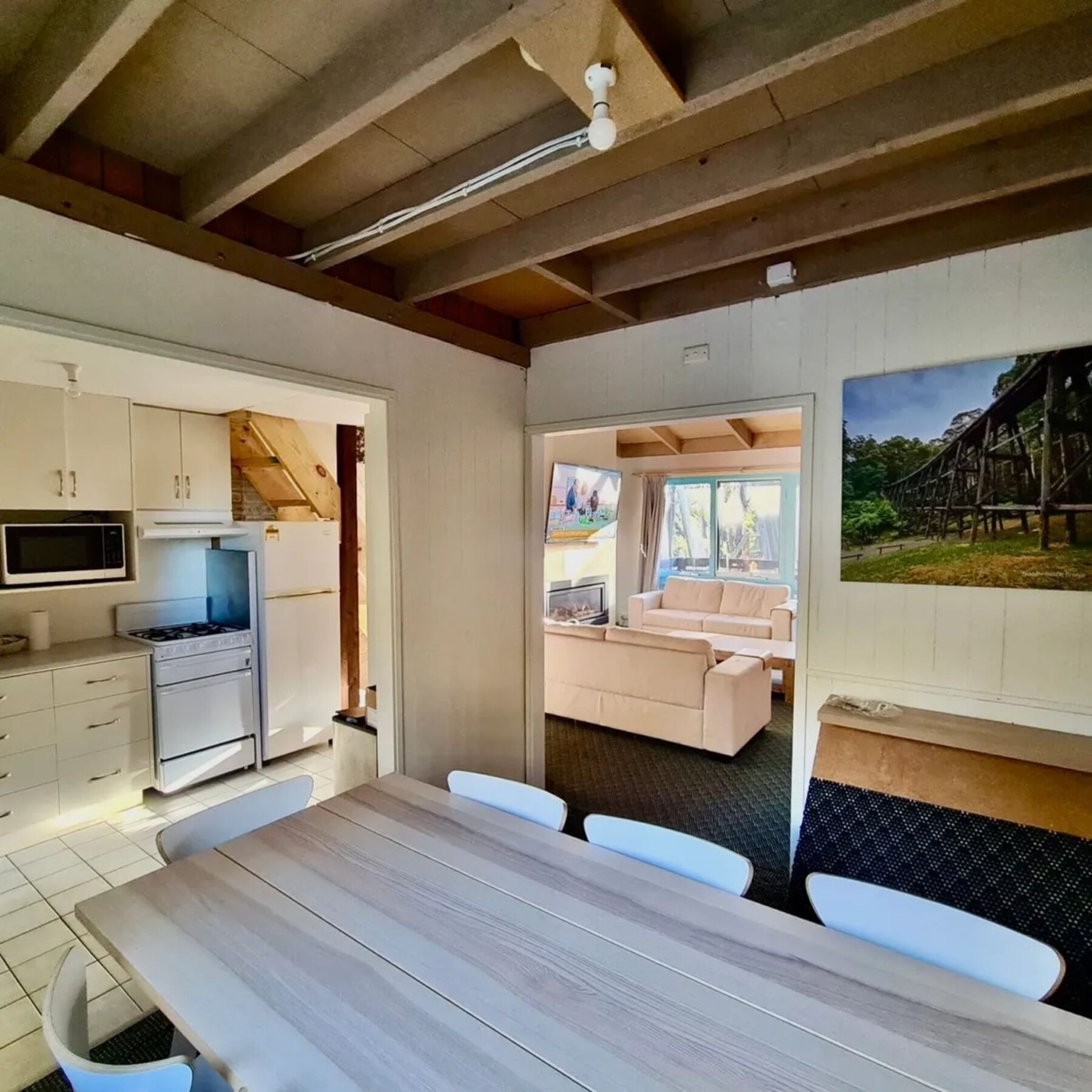 This stylish two-bedroom, two-bathroom apartment offers space, warmth, and everything you need for a relaxing stay. The fully equipped kitchen features a fridge/freezer, oven, stovetop, microwave, toaster, and coffee machine—ideal for preparing anything from a quick breakfast to a hearty dinner. Adjacent to the kitchen, the separate dining area seats 8, creating the perfect setting for shared meals and memorable conversations.