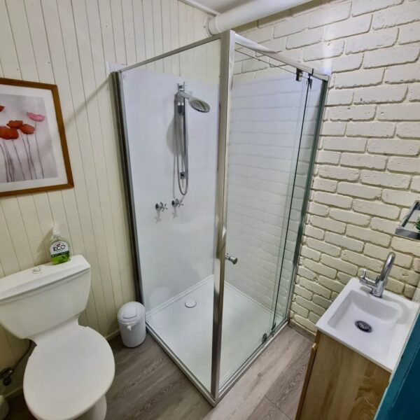 Downstairs, you’ll find both bedrooms designed for comfort and convenience. The first bedroom features a queen bed with easy access to the nearby bathroom. The second bedroom is generously sized and ideal for larger groups or children, offering two tri-bunks (double beds on the bottom and single beds on top), sleeping up to 6 guests comfortably, with plenty of space for luggage. A second bathroom is located inside this room.