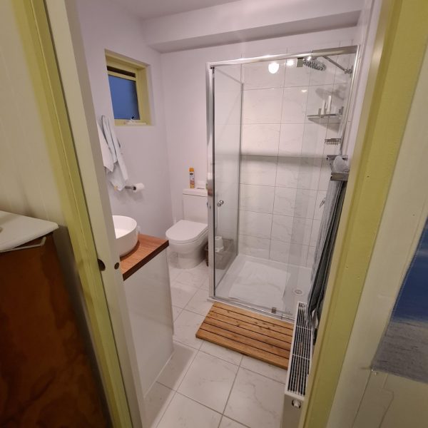 Downstairs, you’ll find both bedrooms designed for comfort and convenience. The first bedroom features a queen bed with easy access to the nearby bathroom. The second bedroom is generously sized and ideal for larger groups or children, offering two tri-bunks (double beds on the bottom and single beds on top), sleeping up to 6 guests comfortably, with plenty of space for luggage. A second bathroom is located inside this room.